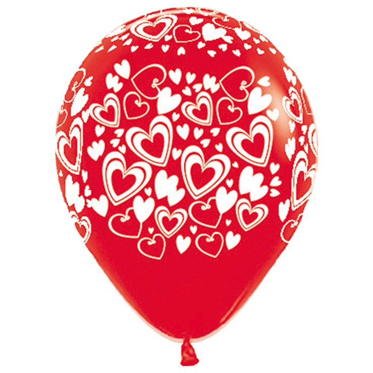 Weiße Herzen in verschiedenen Stilen (gefüllt, umrissen, verschlungen, schraffiert) bedecken dicht die gesamte Oberfläche des kleinen roten Mini-Ballons. Flächendeckender Rundum-Druck.
