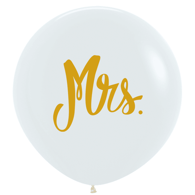 Großer goldener „Mrs.“-Schriftzug in eleganter Kalligrafie-Schreibschrift mittig auf weißem 60-cm-Ballon. Reduziertes, typografisches Design ohne Begleitelemente. Der Schriftzug dominiert die gesamte Vorderseite.