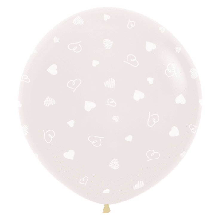 Weiße Herzen in verschiedenen Stilen (gefüllt, umrissen, schraffiert, geschwungen) locker über den großen kristallklaren Riesenballon verstreut. Der Hintergrund scheint durch den transparenten Latex.