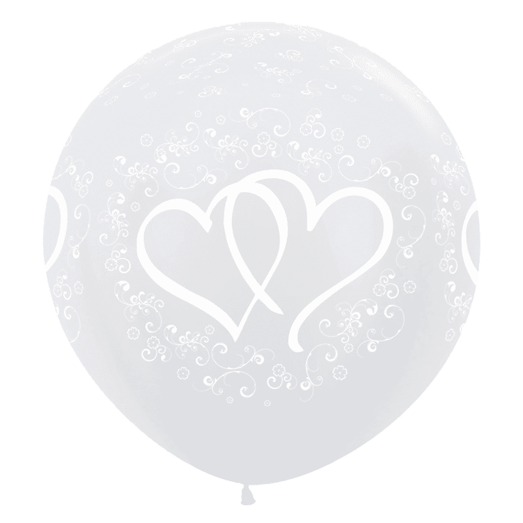 Zwei große verschlungene Herzumrisse in der Ballonmitte, umrahmt von zarten Blumenranken mit kleinen Blüten und Ranken. Weißer Druck auf perlmuttweißem Samt, rundum bedruckt.