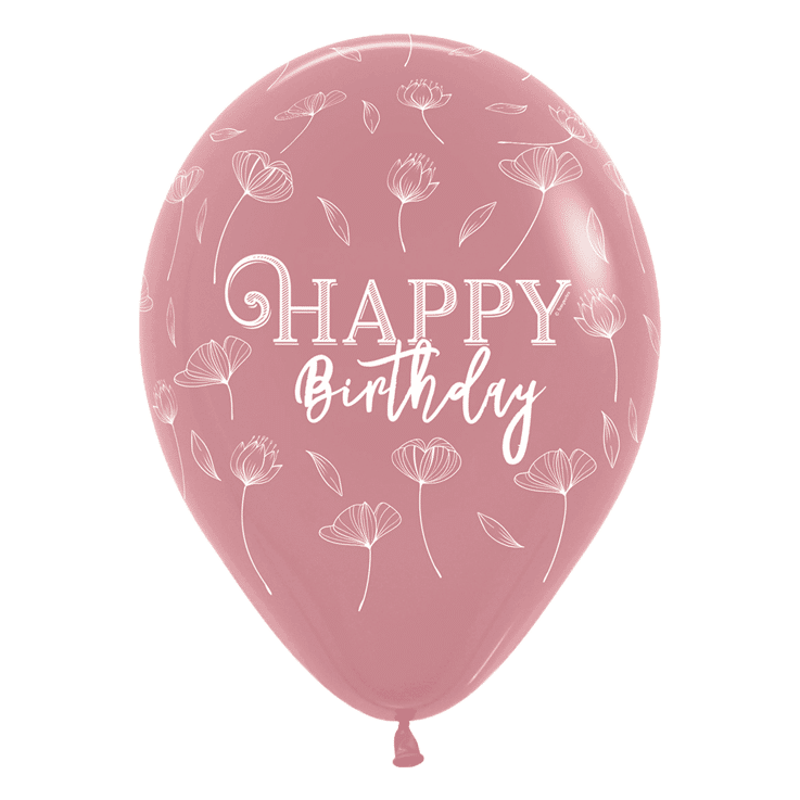Weißer zweizeiliger Schriftzug: „HAPPY“ in Großbuchstaben über kursivem „Birthday“. Zarte weiße Blütenstängel mit offenen Blütenköpfen und Knospen als botanisches Dekor auf Altrosa.