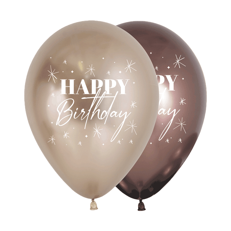 Schriftzug „HAPPY“ in geraden Großbuchstaben über kursivem „Birthday“ mit Unterstrich-Schwung. Zarte Sternchen und Funkelpunkte auf Chromglanz-Oberflächen in Champagner und Trüffel. Die Mischung aus Chromglanz Champagner und Chromglanz Trüffel bringt Abwechslung in die Dekoration.