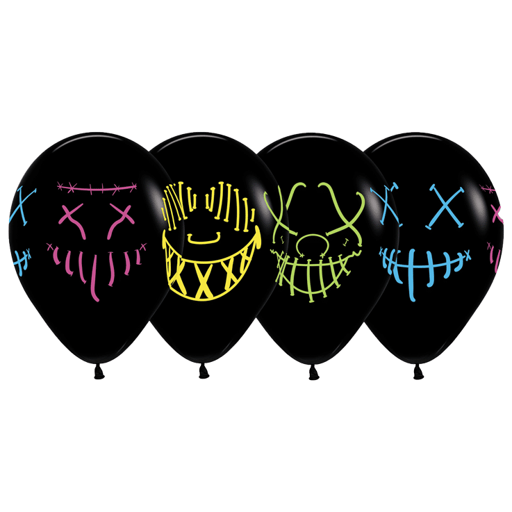 Neon-leuchtende Gruselmasken auf schwarzen Ballons: X-Augen und Naht-Münder in Pink, Gelb, Grün und Blau. Jeder Ballon zeigt eine andere Maske. Leuchteffekt auf dunklem Grund.