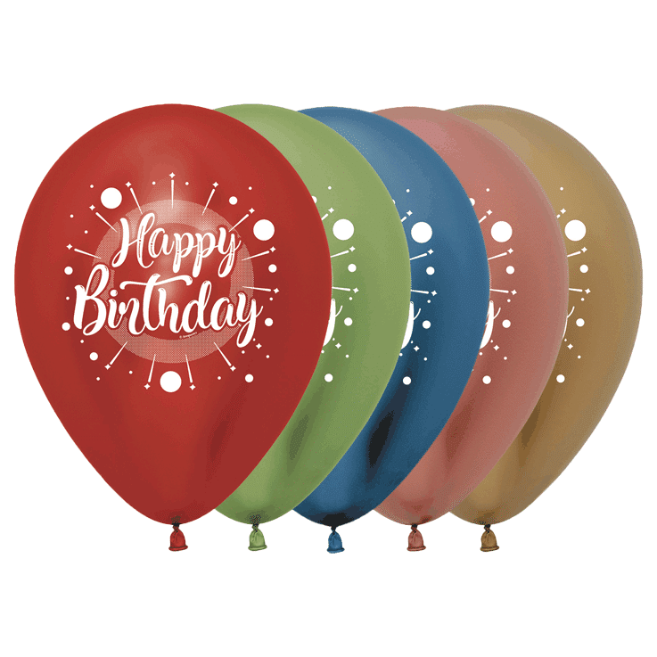 Weißer Schriftzug „Happy Birthday“ in eleganter Schreibschrift mit Unterstrich-Schwung. Weiße Konfetti-Punkte und kleine Sterne auf hochglänzenden Chromglanz-Farben in Grün, Rot, Gold und Blau. Die Mischung aus Blau, Roségold, Grün, Rot und Gold bringt Abwechslung in die Dekoration.