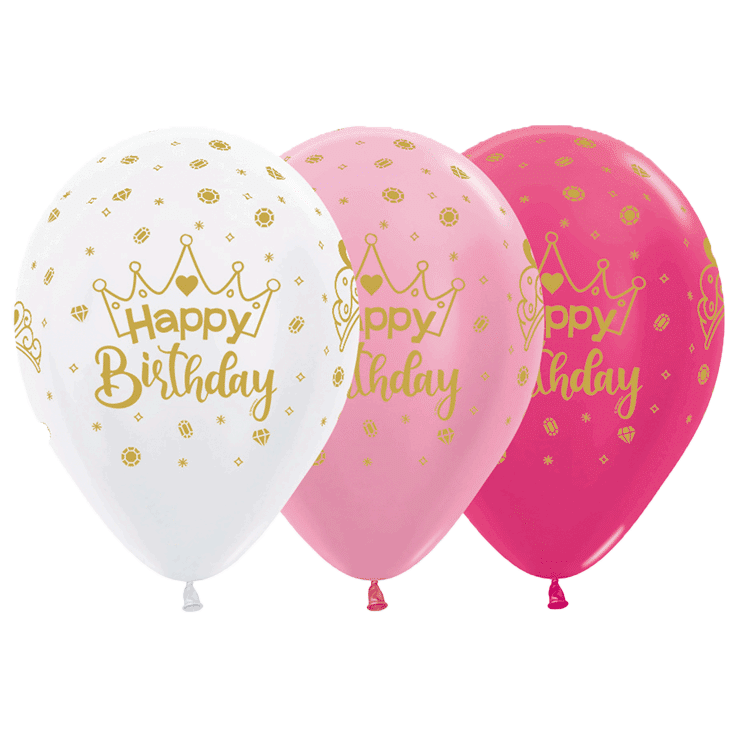 Goldener Schriftzug „Happy Birthday“ in geschwungener Schreibschrift, darüber eine stilisierte Krone mit Herz-Spitze. Goldene Sterne, Punkte und Kreise als Streudekor rundherum. Die Mischung aus Samt Rosa, Pink Metallic und Samt Weiß bringt Abwechslung in die Dekoration.