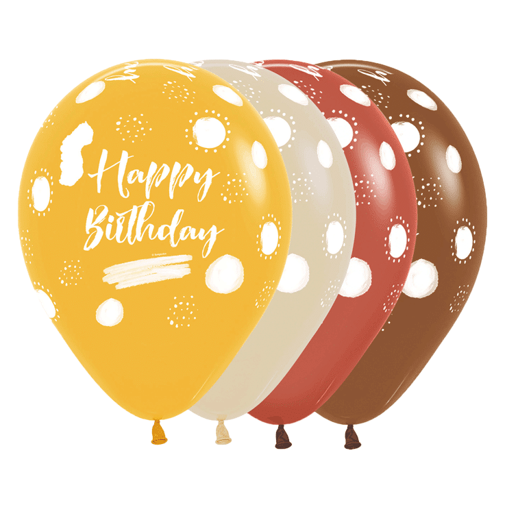 Weißer Schriftzug „Happy Birthday“ in lockerer Schreibschrift. Weiße Konfetti-Punkte in unterschiedlichen Größen auf warmen Erdtönen: Senf, Sandweiß, Terracotta und Kaffeebraun. Die Mischung aus Weißer Sand, Terracotta, Kaffeebraun und Senf bringt Abwechslung in die Dekoration.