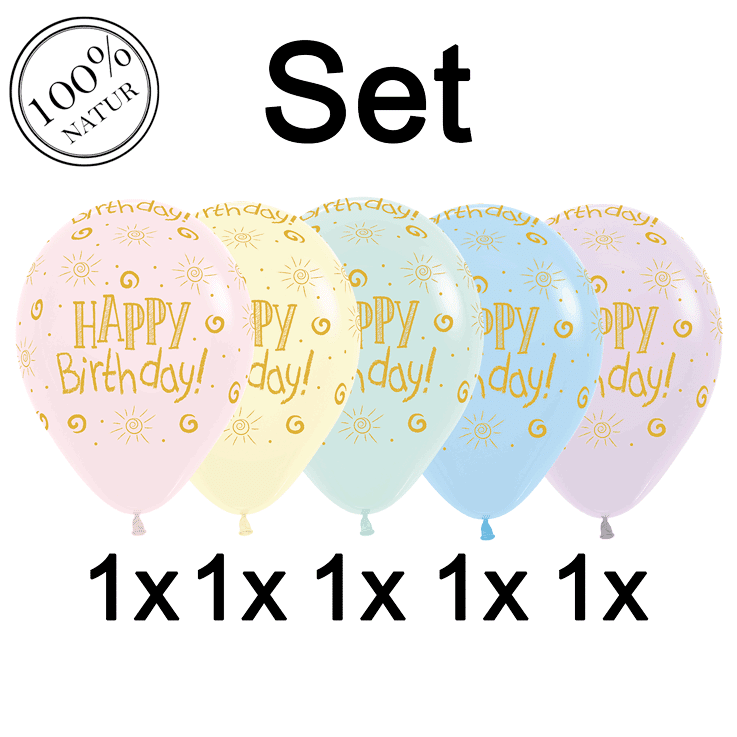 Goldener Schriftzug „HAPPY Birthday!“ in gemischter Block- und Schreibschrift mit Ausrufezeichen. Goldene Punkte und kleine Sonnen-Symbole als Streudekor auf zarten Pastelltönen. Die Mischung aus Rosa, Grün, Lila, Gelb und Blau bringt Abwechslung in die Dekoration.