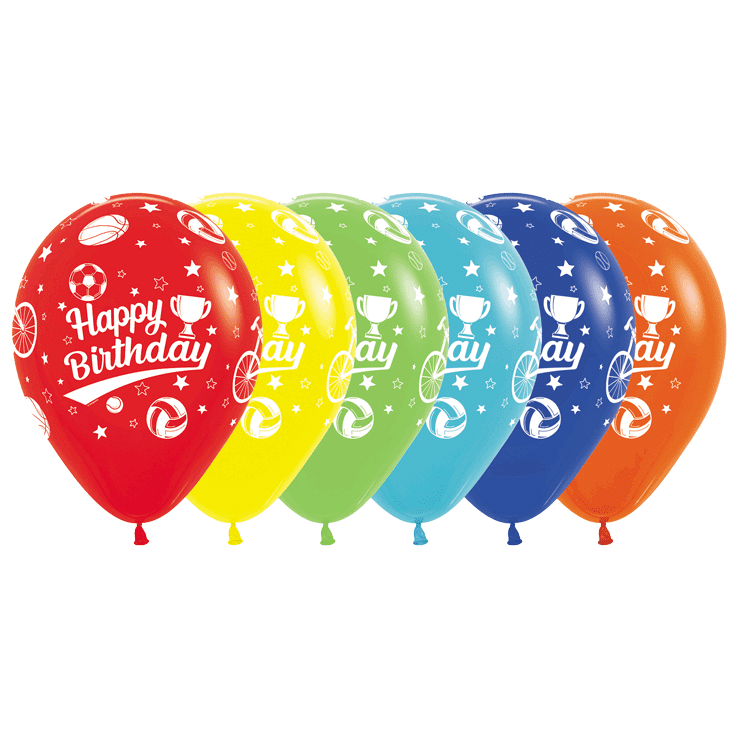 Weißer Schriftzug „Happy Birthday“ in verspielter Schrift. Drumherum weiße Sport-Symbole: Fußball, Basketball, Pokal, Medaille und Turnschuh auf kräftig bunten Ballonfarben. Die Mischung aus Rot, Orange, Grün, Hellgrün, Karibikblau und Königsblau bringt Abwechslung in die Dekoration.