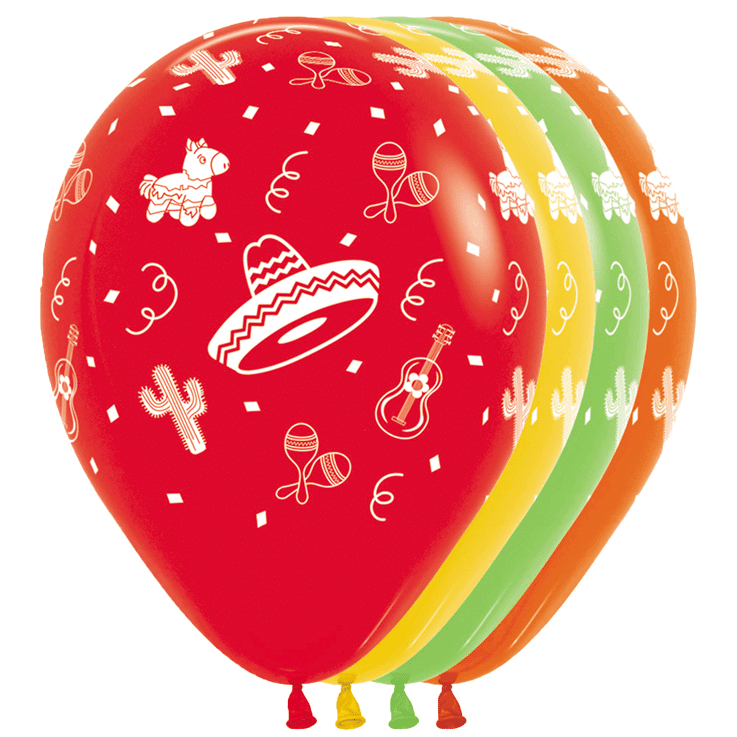 Weiß gedruckte mexikanische Fiesta-Motive auf Ballons in vier leuchtenden Farben: Sombrero, Maracas, Kaktus, Piñata, Chili-Schote und Gitarre. Fröhliche Symbole rundum verteilt. Die Mischung aus Rot, Hellgrün, Honiggelb und Orange bringt Abwechslung in die Dekoration.