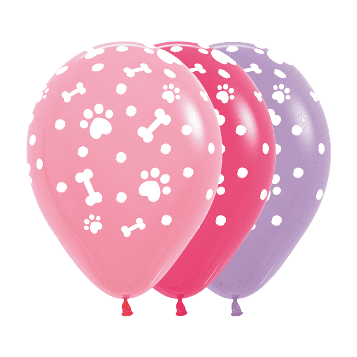 Weiß gedruckte Hundepfoten, Knochen und Punkte auf Ballons in Pink, Flieder und Rosa. Verspielte Anordnung mit verschiedenen Symbolgrößen, rundum bedruckt. Die Mischung aus Rosa, Pink und Flieder bringt Abwechslung in die Dekoration.
