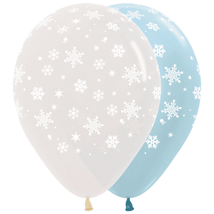 Weiße Schneeflocken in verschiedenen Größen und Formen gleichmäßig über den gesamten Ballon verteilt. Kristallklare und blaue Ballons gemischt. Filigranes Kristall-Muster. Die Mischung aus Kristallklar und Samt Blau bringt Abwechslung in die Dekoration.