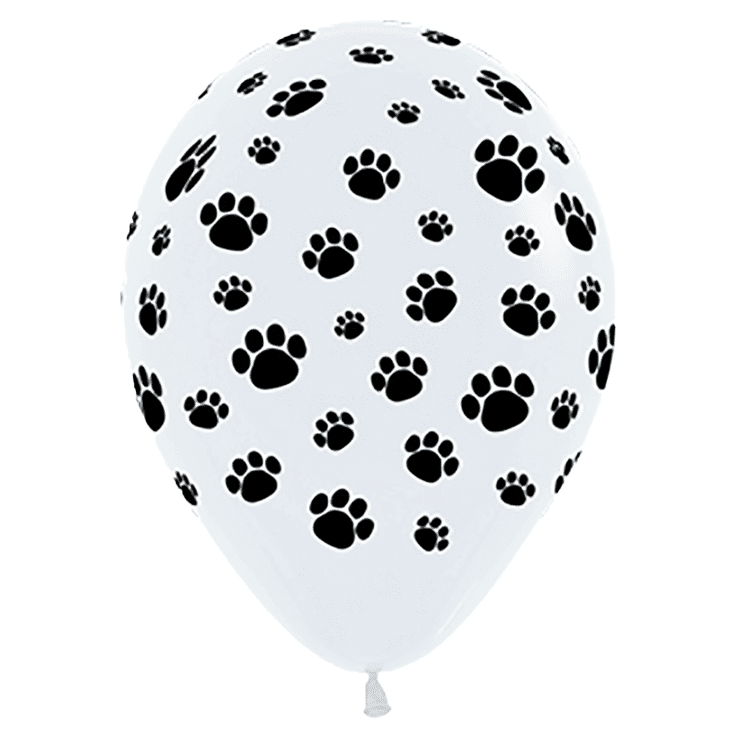 Schwarze Hundepfoten-Abdrücke in verschiedenen Größen gleichmäßig über den gesamten weißen Ballon verteilt. Klarer Schwarz-Weiß-Kontrast, grafisch reduziertes Tatzen-Muster im flächendeckenden Allover-Druck.