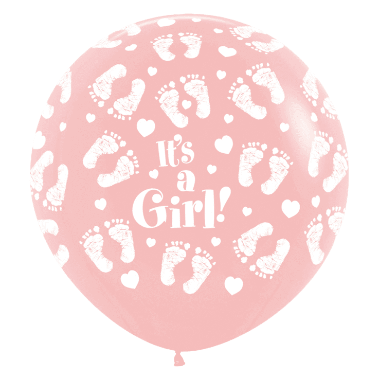 Weißer Druck in verspielter Kursivschrift „It’s a Girl!“ umgeben von Babyfüßchen-Paaren in verschiedenen Größen und Winkeln, dazwischen kleine Herzchen. Rundum-Druck.