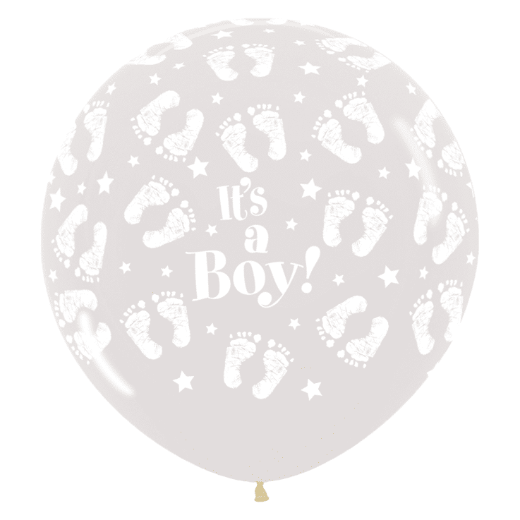 Weißer Druck in verspielter Kursivschrift „It’s a Boy!“ umgeben von Babyfüßchen-Paaren und Sternchen. Transparenter Ballon, Motiv scheint durch den kristallklaren Latex.