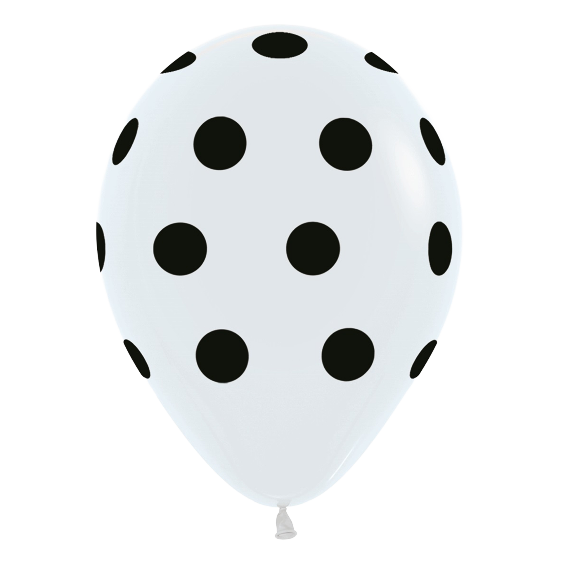 Große schwarze Punkte in gleichmäßigem Abstand über den gesamten weißen Ballon verteilt. Kräftiger Kontrast durch das klassische Schwarz-Weiß-Muster im Retro-Stil.