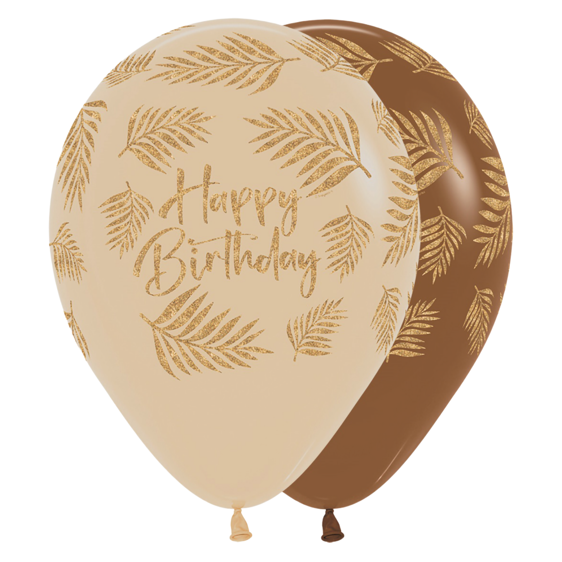 Geschwungener Happy Birthday Schriftzug in goldener Handlettering-Schrift, eingerahmt von großen Palmwedeln und tropischen Blättern. Goldglänzender Druck auf warmem Sand- und Schokoladenbraun. Die Mischung aus Weißer Sand und Kaffeebraun bringt Abwechslung in die Dekoration.